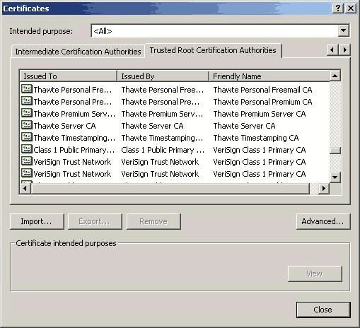 В Таблице 1 показаны денежные затраты на приобретение 40-разрядного сертификата SSL у некоторых организаций, отвечающих за выдачу сертификатов (Certificate Authority — CA). В продаже имеется более надежное 128-разрядное решение, но за дополнительную защиту придется заплатить более высокую цену. Сертификаты VeriSign — очень дорогие, но это самая известная организация, которой я доверяю защиту данных, своих и компании. Еще один веский довод в пользу крупной организации — совместимость ее сертификатов с большинством браузеров. Чтобы увидеть список CA, которые распознает и которым автоматически доверяет Microsoft Internet Explorer (IE) 5.0, выберите пункт Internet Options из меню Tools. Щелкните на разделе Certificates под закладкой Content. На закладках Intermediate Certification Authorities и Trusted Root Certification Authorities диалогового окна Certificates приведены списки CA. На Рисунке 1 показана закладка Trusted Root Certification Authorities.